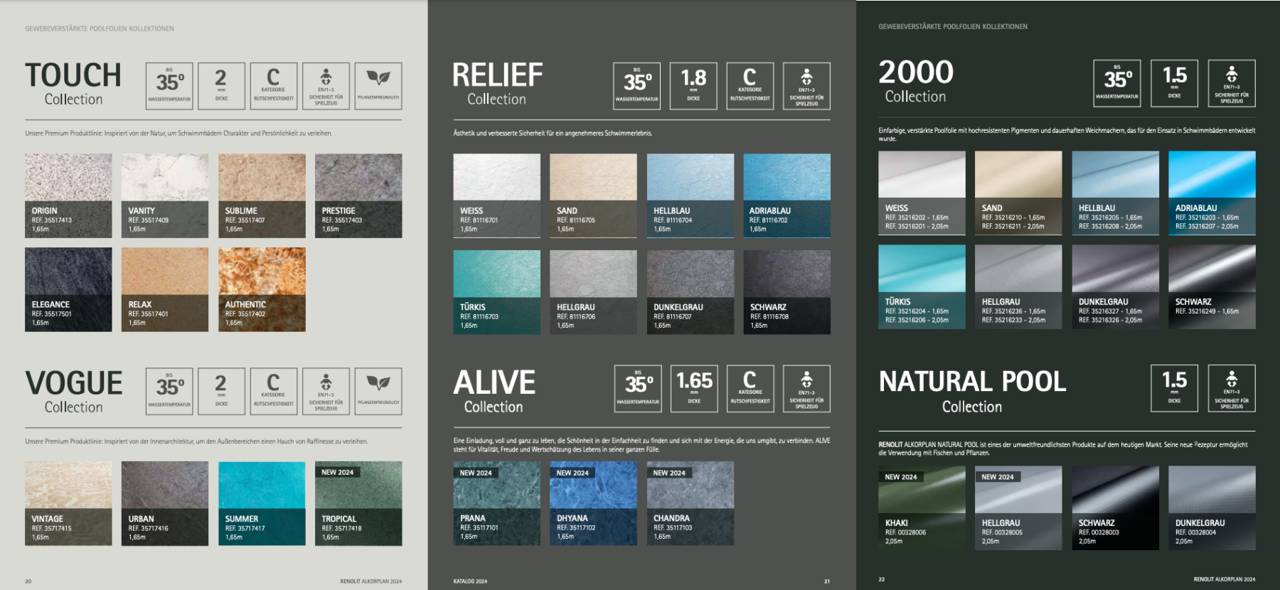 Entdecken Sie die beeindruckende Auswahl an Schwimmbadfolien in Basel, die jeden Ihrer Designwünsche erfüllt. Egal, ob Sie den zeitlosen Edelstahl-Look oder eine moderne PVC-Folie bevorzugen – bei uns finden Sie die perfekte Lösung für Ihre persönliche Wohlfühloase. Unsere hochwertigen Schwimmbadfolien, wie beispielsweise Renolit Alkorplan, stehen nicht nur für ästhetische Vielfalt, sondern auch für herausragende Langlebigkeit und optimale Dichtheit Ihres Schwimmbeckens.
